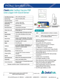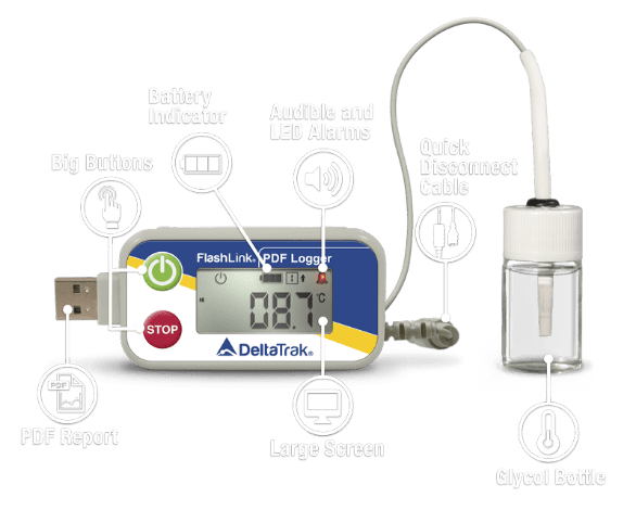 The FlashLink® Certified Vaccine USB PDF Data Logger provides an accurate reading, programmable alarms and sampling intervals, and a USB connection to quickly and easily download temperature data. The FlashLink Certified Vaccine USB PDF Data Logger can be programmed to start automatically or with the option for a delayed start allowing the glycol bottle sufficient time to stabilize to the refrigerator or freezer temperature.